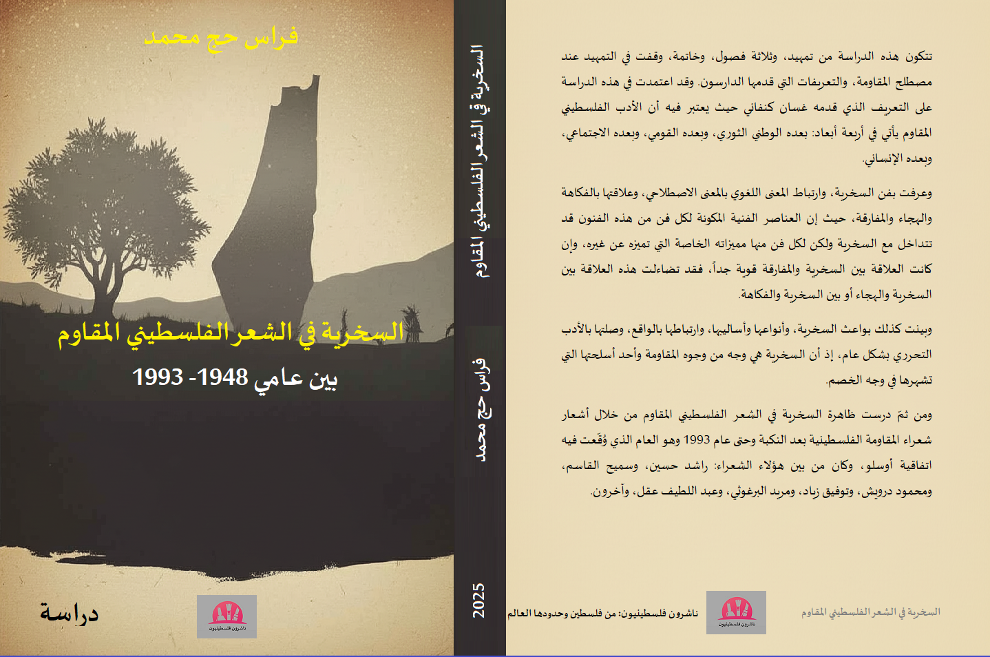 صدر حديثًا عن “ناشرون فلسطينيون” كتاب “السخرية في الشعر الفلسطيني المقاوم بين عامي (1948-1993)”، في طبعته الأولى لعام 2025 بصيغة إلكترونية (eBook)، لكاتبه الباحث والأكاديمي الفلسطيني فراس حج محمد. يقدم هذا الإصدار دراسة معمقة لظاهرة السخرية في الشعر الفلسطيني المقاوم، مسلطًا الضوء على دورها كسلاح أدبي في مواجهة الاحتلال والقهر. يمثل الكتاب إضافة نوعية للمكتبة النقدية العربية والفلسطينية، كونه يتناول جانبًا حيويًا من الأدب الفلسطيني لم يحظَ بالدراسة الشاملة التي يستحقها.
