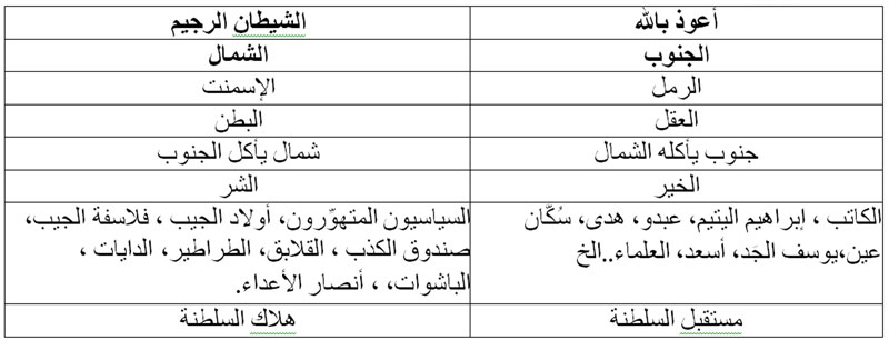 ثنائية الشمال – جنوب، تمتد إلى اللغة. وكأن الكاتب صورة من النخلة، هذه الشجرة المباركة، التي تَكرَّر ذكرها في القرآن، تضرب بجذورها في أعماق الرمل، تمتصُّ الماء، فتثمر وتنفع.
