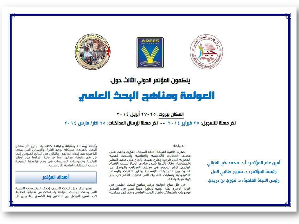 يعتبر مركز جيل البحث العلمي إحدى المؤسسات العلمية التي وظفت إيجابيات العولمة واستفادت من تقنياتها الحديثة في تعميق التواصل بين الباحثين ومد الجسور بينه وبين كل المهتمين بالبحث العلمي في المجالات التي ينشط فيها،ومد الجسور بينه وبين كل المهتمين بالبحث العلمي وفي مجالاته.إن أهمية هذا الموضوع البحثي الذي يدور حول علاقة العولمة بمناهج البحث العلمي هو ما دفع بمركز جيل البحث العلمي ورؤساء أقسامه دعوة الباحثين من أنحاء العالم كافة لمناقشة هذا الموضوع