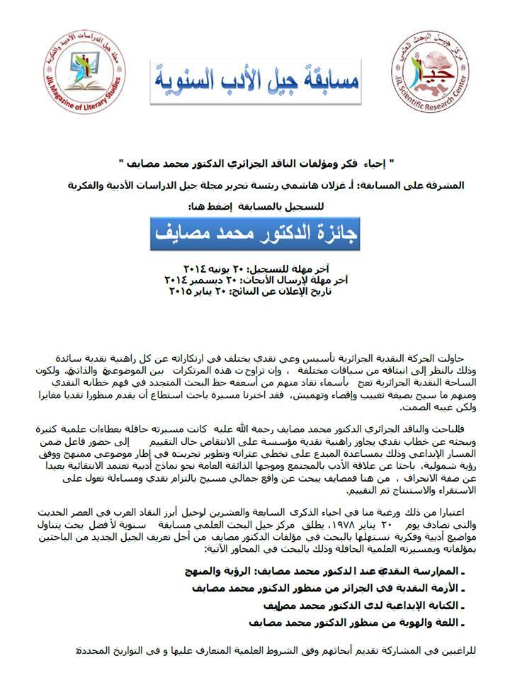 اعتبارا من ذلك ورغبة منا في احياء الذكرى السابعة والعشرين لرحيل أبرز النقاد العرب في العصر الحديث والتي تصادف يوم 20 يناير 1978، يطلق مركز جيل البحث العلمي مسابقة سنوية لأفضل بحث يتناول مواضيع أدبية وفكرية نستهلها بالبحث في مؤلفات الدكتور مصايف من أجل تعريف الجيل الجديد من الباحثين بمؤلفاته وبمسيرته العلمية الحافلة وذلك بالبحث في المحاور الآتية: