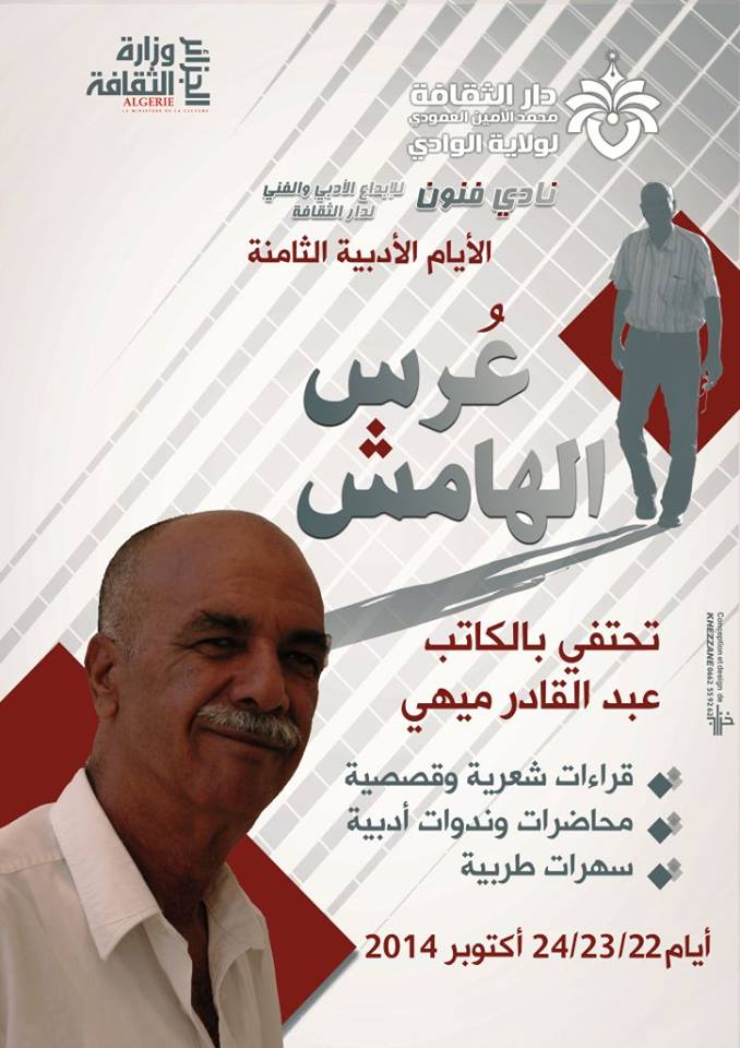 ضمن نشاطات دار الثقافة لولاية الوادي لسنة 2014 ينظم نادي الفنون للإبداع الأدبي والفني لدار الثقافة أيام 21/22/23 أكتوبر 2014 الأيام الأدبية الثامنة :”عرس الهامش ” وستخصص هذه السنة للإحتفاء بالكاتب الأستاذ عبد القادر ميهي