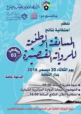 احتضنت دار الثقافة محمد الأمين العمودي بالوادي يوم الثلاثاء 20 ديسمبر 2016 احتفائية مميّزة نظمتها الرابطة الولائية للفكر والإبداع بولاية الوادي، وبالتنسيق مع دار الثقافة بقاعة المحاضرات الكبرى، موضوعها إعلان نتائج المسابقة الوطنية للرواية القصيرة بحضور مسؤولين على القطاع الثقافي، الأستاذ جمال الدين عبادي مدير دار الثقافة، الأستاذ محمد حامدي مدير دار الثقافة سابقا، الأستاذ تامة التجاني مدير المكتبة الرئيسية للمطالعة العمومية، أعضاء لجنة التحكيم البروفيسور عميش عبد القادر من جامعة الشلف، الدكتور ميسوم عبد القادر من جامعة الشلف، الدكتور حفيظة طعام من جامعة تسمسيلت، أساتذة ضيوف: الدكتور ساري محمد روائي ومترجم من جامعة الجزائر، الدكتور هيمة عبد الحميد شاعر وناقد من جامعة ورقلة، الدكتور عبد الله كرّوم أستاذ من جامعة أدرار، الأستاذ ينينة عبد الكريم شاعر وقاص، وصاحب دار نشر، مدير سابق لدار الثقافة بأدرار، الأستاذ مخبوتي نور الدين شاعر من تلمسان، أعضاء الرابطة، أعضاء جمعيات ثقافية، الكثير من الكتاب والمبدعين، والفنان عبد الله مناعي، والفنان غزال عبد الرحمن، والعازف الفنان نور الدين مناني، والنخبة المثقفة، وسائل الإعلام من إذاعة، ويوميتي التحرير، والجديد، وقناة النهار.. نشّط الاحتفائية الشاعر المتميّز غريب بشير، الأستاذ بجامعة حمّة الآخضر بالوادي، وعضو مكتب الرابطة